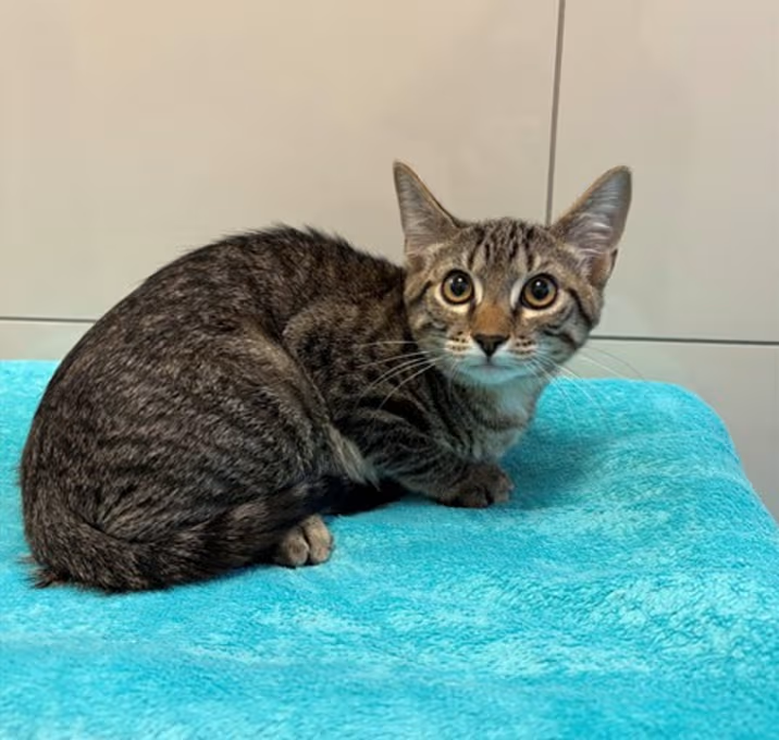 This little baby is pure kitten chaos: zoomies, pounce attacks, nap marathons. Domestic Shorthair kittens are playful, curious, and smart — they grow into affectionate, loyal adults. Kaya is adorable and already has that “pick me up!” face mastered.